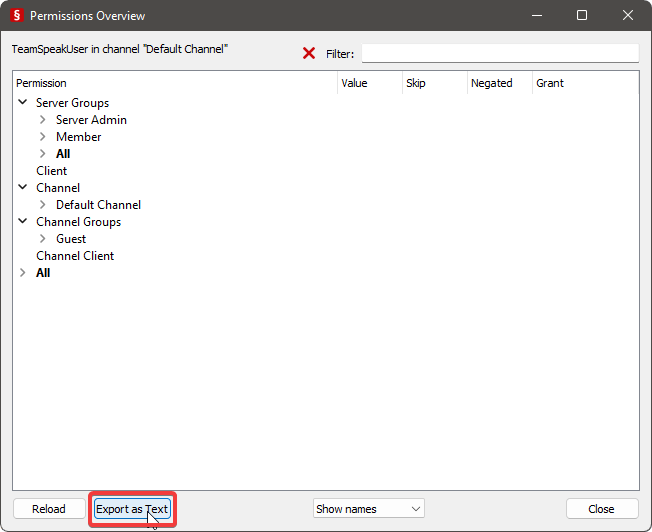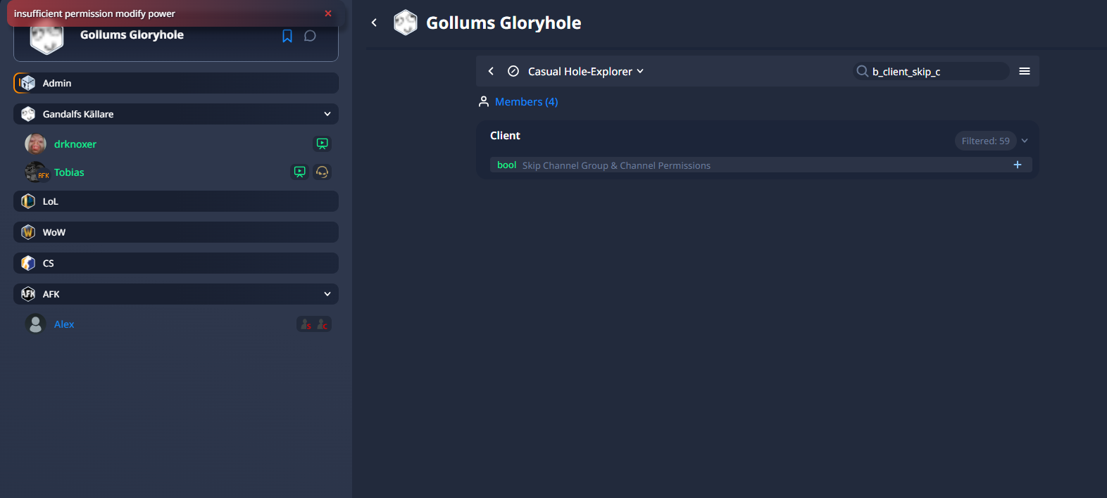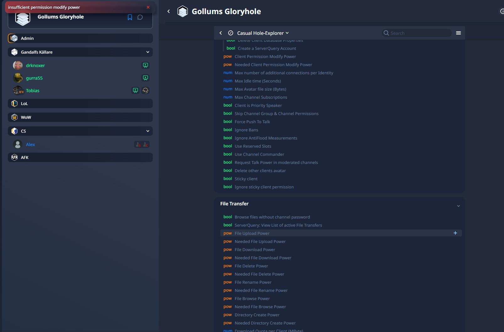 To further investigate this issue without random guessing. I’ll need a Permission overview. For that you’ll need to download the TS3 client, no login needed. But the client needs the Server Admin group.