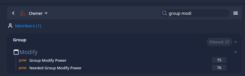However, when I tried giving it a custom icon and a different name, I get errored out with “insufficient permissions”, which unfortunately makes sense: The owner group was given a Group Modify Power of 75, but the Needed Group Modify Power for the Owner group is set to 76.