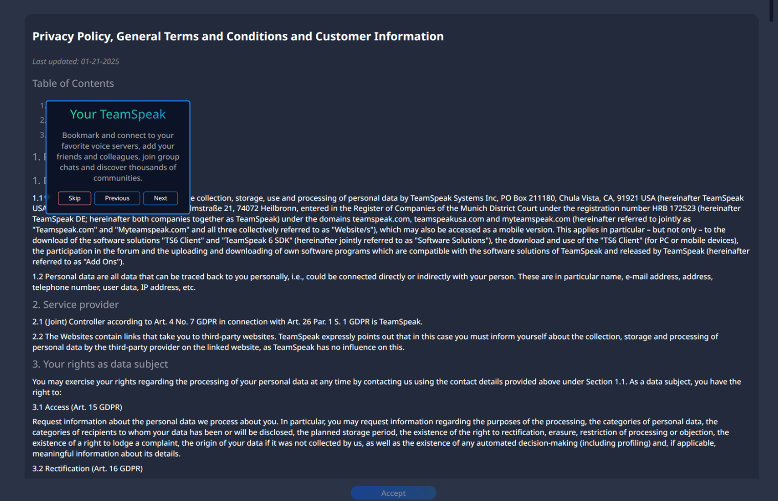 I’ve just relaunched the client and have got a privacy policy/T&Cs popup which actually blocks the guide on how to use Teamspeak. Is there a way of re-enabling this ‘Your Teamspeak’ guide after I’ve skipped it? I’m a brand new user and have got no idea how to use TS.