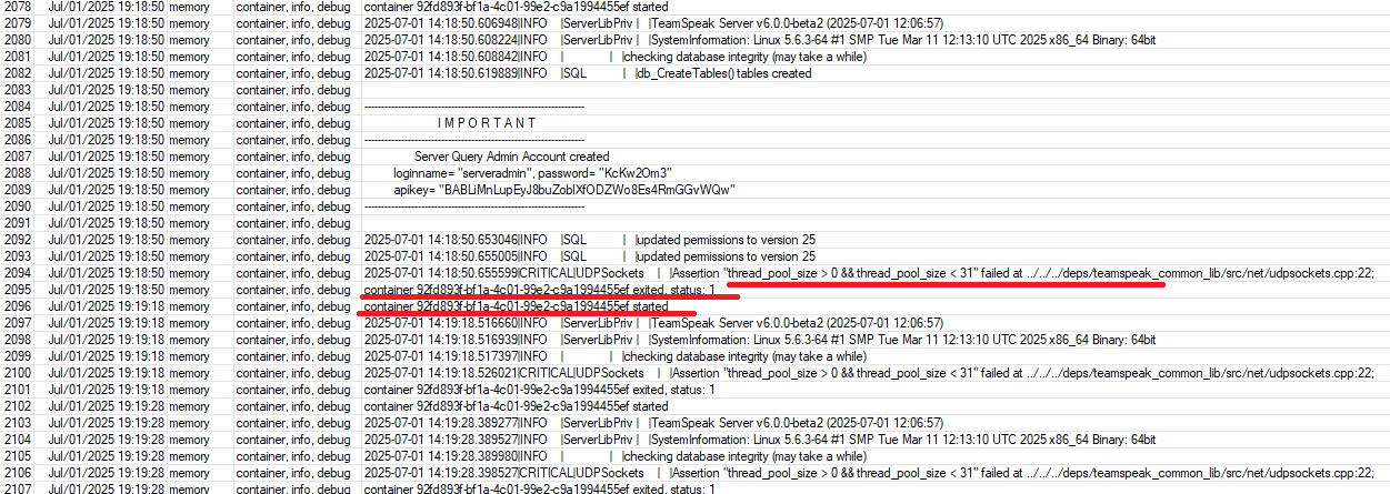 This is 1vCPU 1GB RouterOS server (x86 CHR) so maybe low resource is an issue. Starts fine on Ubuntu 24 LTS. As you may see on screenshot, assert message comes, then container crashes with code 1. I’ve started it manually again and the behavior is the same. As you may see above, this is first start of the container.