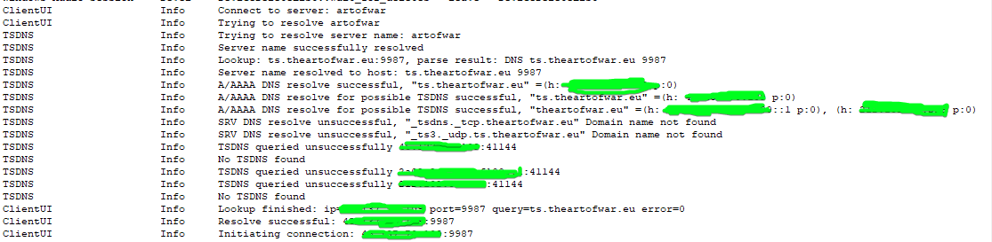 That actually doesn’t help me, since for what I can understand it’s connecting in your server using IPv6 which it’s not my case since I’m trying to use Ipv4 with TSDNS setup… I wonder if I need to port forward TCP for port 9987 as well to make this work, although it should be using UDP not TCP… I port forward the TCP port for TSDNS and it works every time…