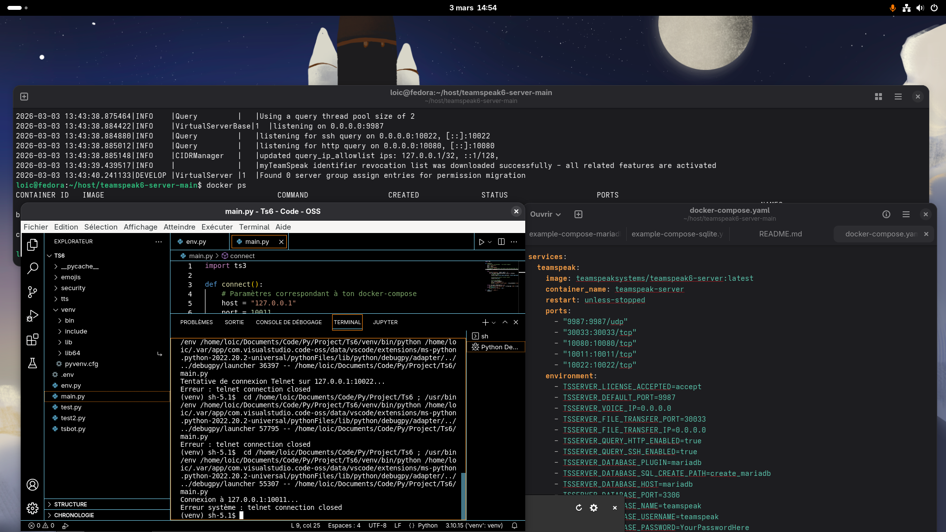 So , i am hosting a teamspeak 6 server on Linux under Fedora Workstation and Docker , and wanted recently to code a bot for my personnal use .