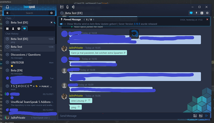 First, it is very annoying that at times when Teamspeak is well attended, the chat is very delayed and sometimes messages are not sent correctly.