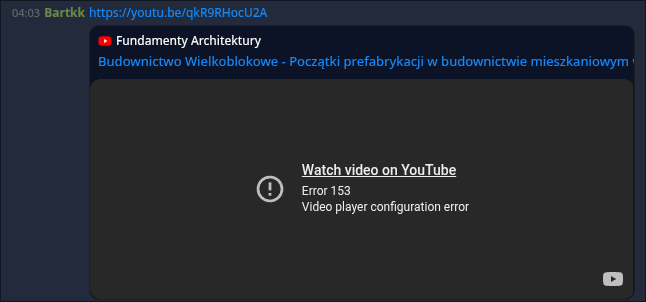 All YouTube embeds in chats are broken and display Error 153. Video player configuration error. After inspecting the network requests, it appears that the Referer header is not being included in the requests, which seems to be causing the error.